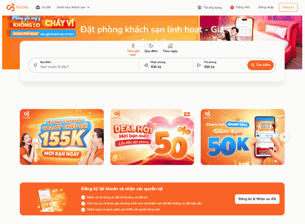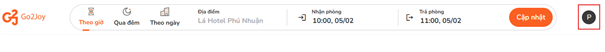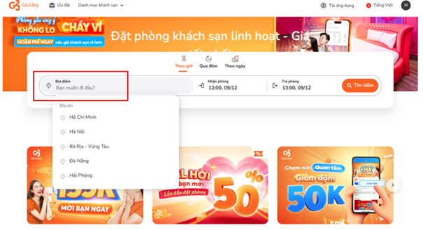 Khách hàng điền thông tin địa điểm muốn đi, ngày giờ nhận/trả phòng vào ô tìm kiếm Go2Joy.vn hoặc tìm phòng theo Danh mục khách sạn