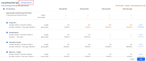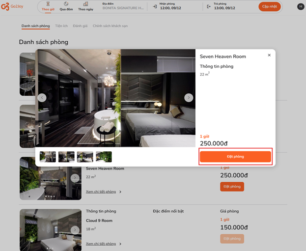 Nhấp chuột vào khách sạn ưng ý, sau đó khách hàng lựa chọn loại phòng theo nhu cầu sử dụng. Sau đó click vào nút “Đặt phòng”.