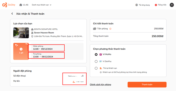 Khách hàng nhấn nút “Đặt phòng”, sau đó kiểm tra thông tin đơn hàng.