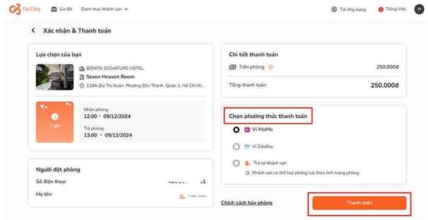 Giao diện hệ thống hiển thị bước thanh toán tiền đặt phòng. Vui lòng lựa chọn phương thức thanh toán phù hợp với nhu cầu của người dùng. Sau đó nhấn chọn nút “Thanh toán”.