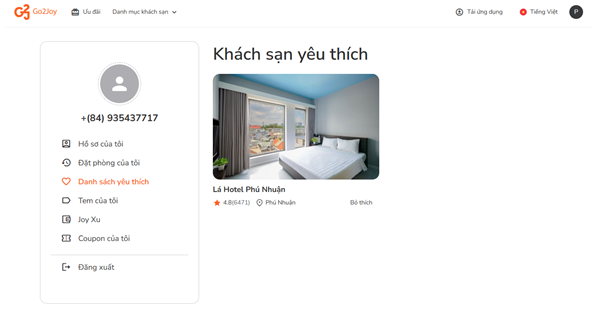 Tính năng yêu thích cho phép người dùng lưu lại các Khách sạn yêu thích trên web Go2joy.com.vn để dễ dàng tìm lại và đặt lịch sau.